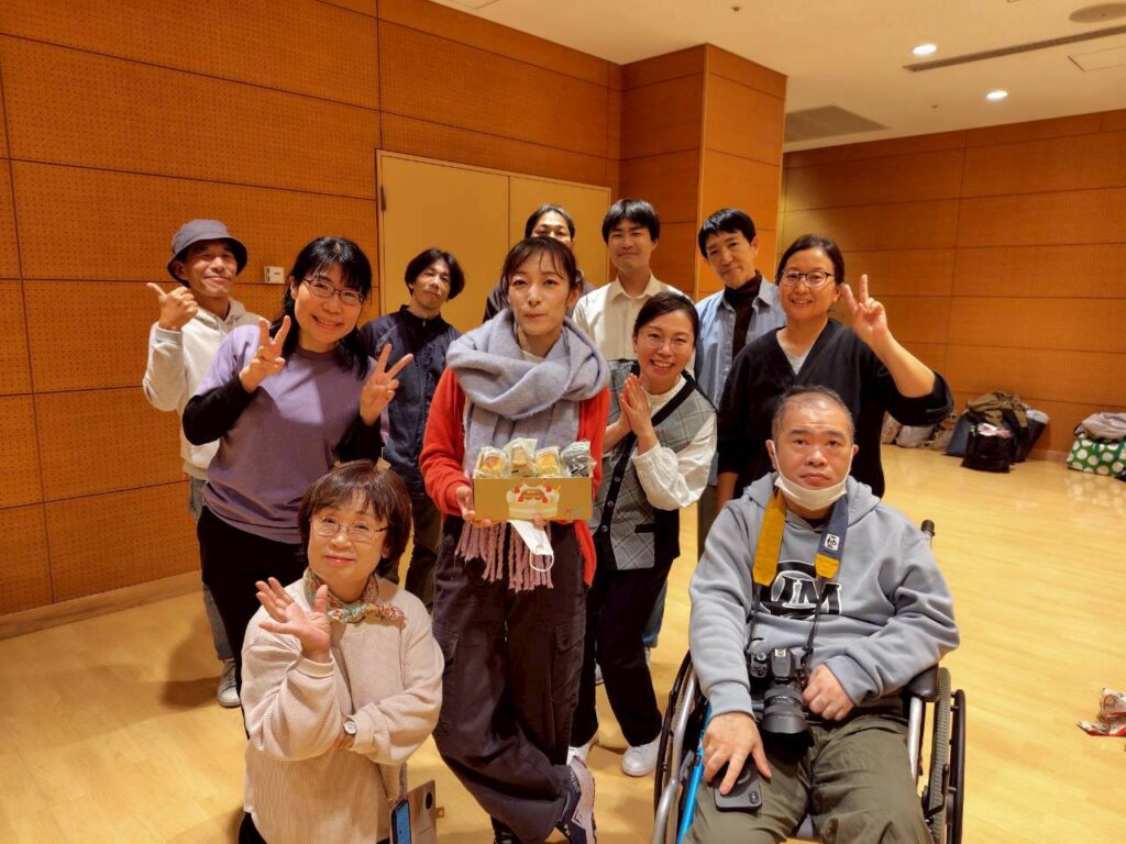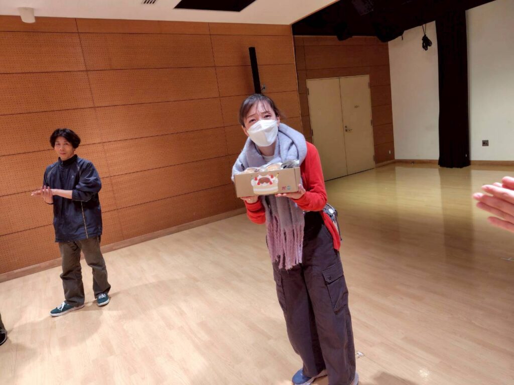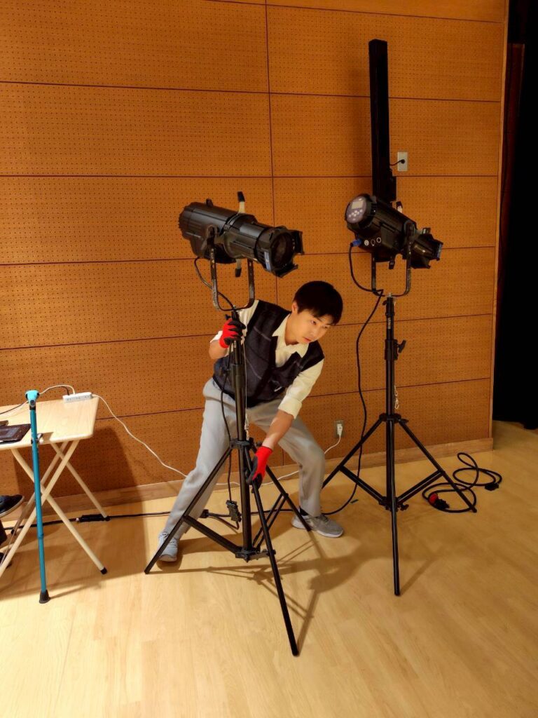 ↑照明班は、灯体のつり込みです   幕と同化しちゃってますが梯子の上にはふかみんがいますー   見えるかな?       これらの灯体をみんなつり込みしていきます     高所作業なので気を付けてね。   ジンバでは必ず梯子を支えます。   今はLEDで熱くないし最近はあまりうるさく言われないのですが 私たちが高校生の時に習った、長袖長ズボンに軍手という教えを守って仕込みしていきます   基本スタイルですね。   そして 他の班は・・・     なんか隅っこに集まってますね   これは・・・     みんなで何か作っています     なんでしょうね   「店」って書いてあるので何かの看板のようです       ↑そして、こちらはなんでしょう?? なんか細かい作業してますね   みんなで協力して作業しています。       ↑ままが必殺仕事人のように持っているのは結束バンド   看板つくりに使います。     ↑恒例の箱馬布包み作業中   これは本公演でもほぼやってる作業ですね。       そして・・・       お、アレックスがテーブルに鎮座しています。   大量の眼鏡が陳列していますね。   みんなでこちらも整えていきます   舞台は今照明仕込み中なので、 あとで舞台に運び込んでいきますよ         なんでしょうね、ワクワクしますね~     できた看板を     バトンにつり込みます (スタッフさんにお願いしました)   そして・・・   机も運び込んだら舞台の完成です!!     ここからどんな物語ができるのかな??   撮影はビデオの画面を壁に映して 照明の白飛びなどを確認しながら撮影していきます   便利な世の中になったものですね・・・。     メイクをして衣装を着て   さあ、撮影開始!!!     撮影自体はほぼ通しの芝居を3本撮影していきました。 あっという間に時は過ぎ     あっという間にバラシの時間   吊ってる写真なのか バラしてる写真なのか どっちかわからなくなるくらい、 さっき吊ったものを原状復帰していきます   一日本番はあっという間ですね     お疲れ様でした!   そして、帰りの会では・・・   ささやかですがお誕生日会も♪       さあ、あとは私が編集するのみ!!   がんばるぞ!!   お芝居公開までもう少しお待ちくださいませ♪