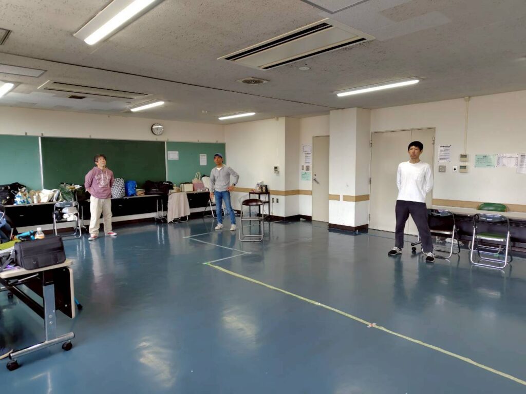 ちょっと息切れしながらストレッチ頑張り中 怪我のないように体をほぐしていきましょう そして発声練習です 今日はセリフを言うときにシッカリ声を出すことを意識する稽古 発声練習で声が出ても、いざ本番のセリフの時に声が出なかったら意味がないですからね