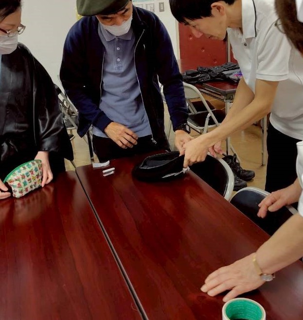 ↑虐待じゃありませんよ 発声練習です!! お腹の使い方訓練中!! さあ、そしていよいよ通し稽古の準備です。 今日はそろっている衣装はすべて着用して行います ↓なにやら衣装調整中